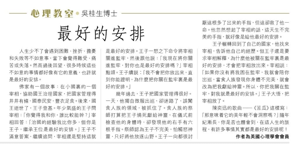 佛家有一個故事:在小國裏的一個宰相,協助國王治理國家,把國家管理得井井有條,國泰民安,豐衣足食。後來,國王逝世了,王子登基。年少氣盛的王子問宰相:「你覺得我和你,誰比較能幹?」宰相回答:「治國的經驗我比你多,但你是王子,繼承王位是最好的安排。」王子不滿意答案,繼續追問,宰相還是堅持這就是最好的安排。王子一怒之下命令將宰相關進監牢,然後跟他說:「我現在將你關進監牢,對你也是最好的安排嗎?」宰相點頭。王子續說︰「我不會把你放出來,直到你能證明,為什麼把你關在監牢裏是最好的安排。」