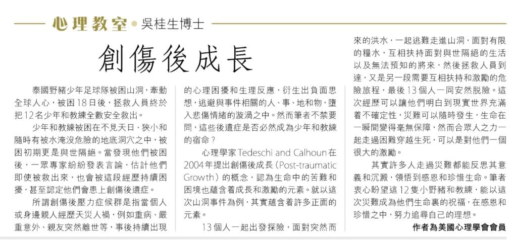 所謂創傷後壓力症候群 (post-traumatic stress disorder),是指當個人或身邊親人經歷天災人禍,例如重病、嚴重意外、親友突然離世等,事後持續出現的心理困擾和生理反應,衍生出負面思想,逃避與事件相關的人、事、地和物,墮入悲傷情緒的漩渦之中。然而筆者不禁要問,這些後遺症是否必然成為少年和教練的縮命?難道他們往後都只能活在痛苦的回憶和恐懼之中?