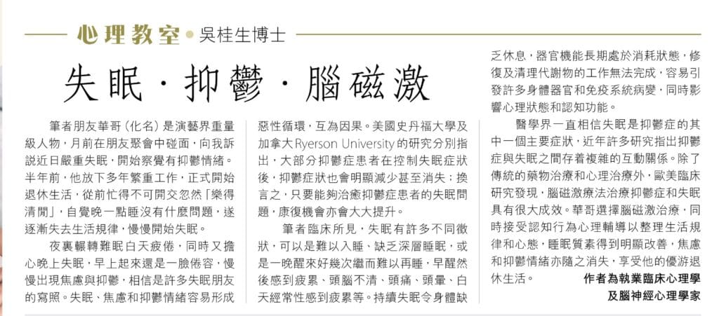 醫學界一直相信失眠是抑鬱症的其中一個主要症狀,近年許多研究指出抑鬱症與失眠之間存著複雜的互動關係。在治療上,除了傳統的藥物治療和心理治療外,歐美臨床研究發現,腦磁激療法在治療抑鬱症和失眠上具有很大的成效。
