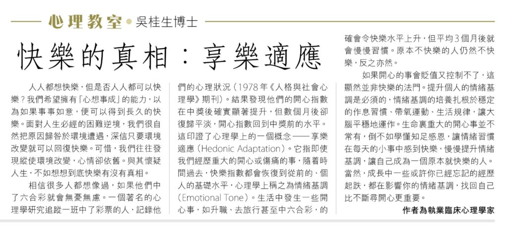享樂適應 (Hedonic Adaptation) 是一種常見的心理現象,指即使我們經歷重大的開心或傷痛的事,隨著時間過去,快樂指數都會恢復到從前的、個人的基礎水平(baseline),心理學上稱之為情緒基調(Emotional Tone)。生活中發生一些開心事,例如升職、去旅行、甚至中六合彩,的確會令你的快樂水平上升。但人在平均3個月後,就會慢慢習慣。快樂的感覺大大聲來,細細聲走,直至不再被留意。原本不快樂的人仍然不快樂,反之亦然。