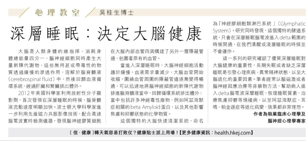 這一系列的研究確認了優質深層睡眠對大腦健康的重要性,長期失眠或者缺乏深層睡眠是引發心理疾病、異常精神狀態,以至大腦退化的重要因素。筆者經常以腦磁激或者腦神經回應治療等非藥物方法,幫助病人進入delta腦電波深層睡眠,恢復睡眠質素、治療焦慮抑鬱等情緒病,以至阿茲海默症、耳鳴、柏金遜症等退化病變,效果都非常理想。