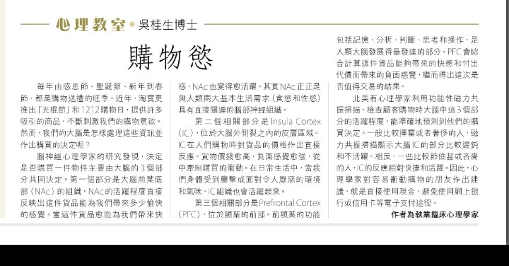 每逢年尾都是購物的日子,由感恩節到聖誕節、新年、春節,都是購物送禮的旺季。近年,淘寶更推出光棍節和1212購物日,不斷刺激我們的購物意慾,在催促我們購物送禮的同時亦提供許多吸引的商品。然而,我們的大腦是怎樣處理這些資訊並作出購買的決定呢?