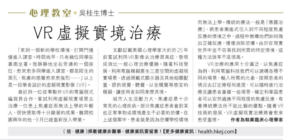 最近與一位從事製作VR的電腦程式編寫員合作,嘗試利用虛擬現實場景去治療一位患上焦慮症而無法上學的年青人,很快便取得十分顯著的成果,離開校園兩年的他,九月已經重新投入學業。